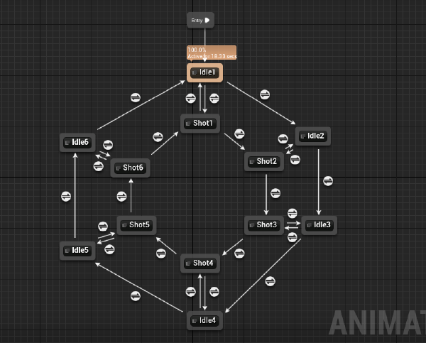 Here’s the view of the animation state machine that resolved all the shooting and rollback transitions between states (it also automatically resolves the reloading and some corner animation desynchronization cases).